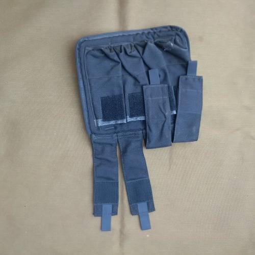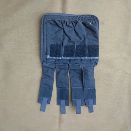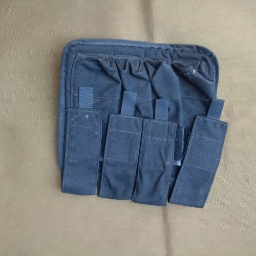 These pouches are scarce - vests are normally seen already fitted with the R4/5 mag pouches - this pouch threads onto the Recce black urban vest with a strap system simialr to MOLLE (reverse idea used here) - these can be also threaded onto a belt and used as a stand-alone for 4 x SMG (Uzi/ MP5 type mags) - also even BHP 20 rd mags for a pistol!
