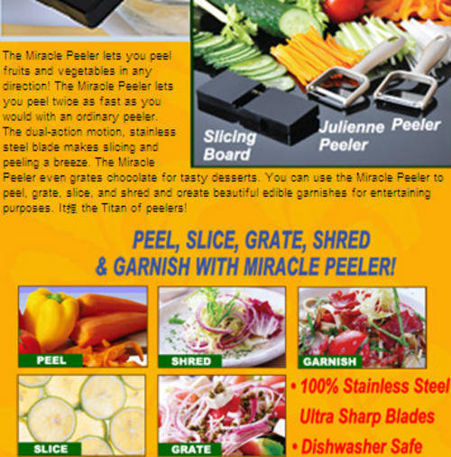 The MIRACLE PEELER lets you peel fruits and vegetables in any direction! The Miracle Peeler lets you peel twice as fast as you would with an ordinary peeler.