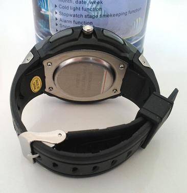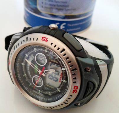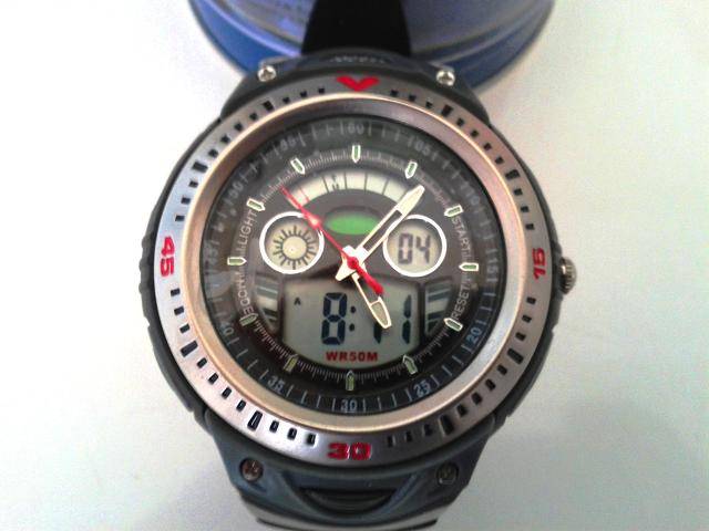 This men's sport watch includes, a stopwatch and is water resistant up to 50 Meters.