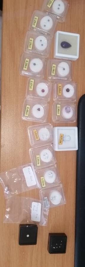 MOZAMBIQUE GARNETS, SAPHIRES, TOPAZ, WHITE PEARLS, ORANGE PINK PEARLS, AMETHYST PURPLE CUBIC ZIRCONIUM AND ROUND SINGLE DIAMOND (5mm DIAMETER) and box with 9 small diamonds