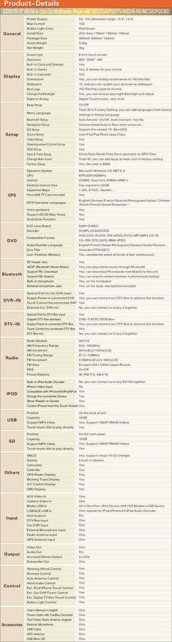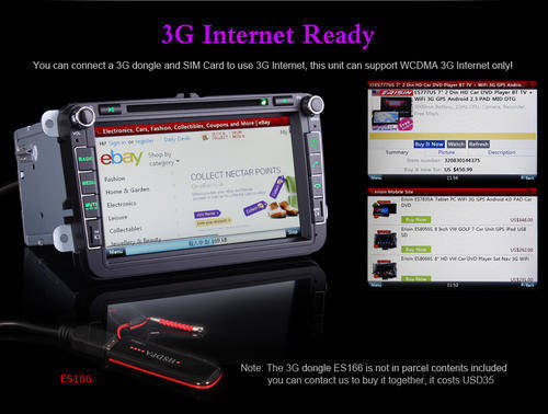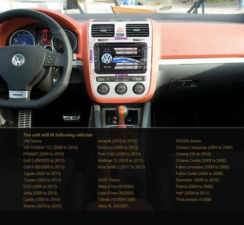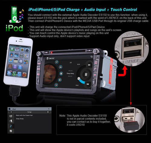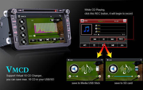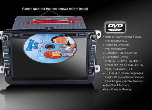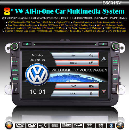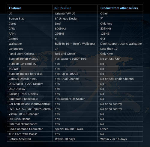 Original VW UI, MTK3360 800MHz CPU, Dual Core, 256MB RAM, Dual Channel CanBus Decoder included (it costs GBP35), support OPS/Radar/Air Climate Control/OBD/Backing Track Display, support 1080P RMVB Video, support the newest 10-Band EQ, support WiFi and 3G WCDMA Internet, VMCD---Virtual 10 CD Changer, Bluetooth PB-Download and PB-Search, Steering Wheel Control, built-in 6 Games, Calculator, 102 Start Unit Logos, 10 internal wallpapers and can update user's wallpaper,, Red and Green 2 Button Light Colors, external Microphone incl., show iPod/iPhone4/5/iPad playlists, Support Portable Hard Disk up to 500GB, Car Recorder and DVB-T/ATSC Box input + power supply + Touch control