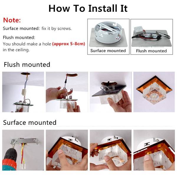 Specifications: Material: Stainless Steel+ Crystal Input Voltage: AC220V Wattage: 5W Installation: Surface Mounted Light Color: White(6000K), Warm White(3000K), Multi-color Features: Adding to a sense of mystery with its unique shape and aesthetic lighting for the home life Most beautiful in the fashion house decoration