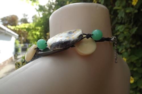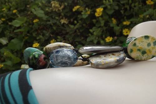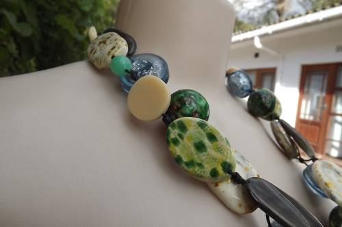 Modern bulky necklace with large striking blue and green colourful beads.Will transform your dress