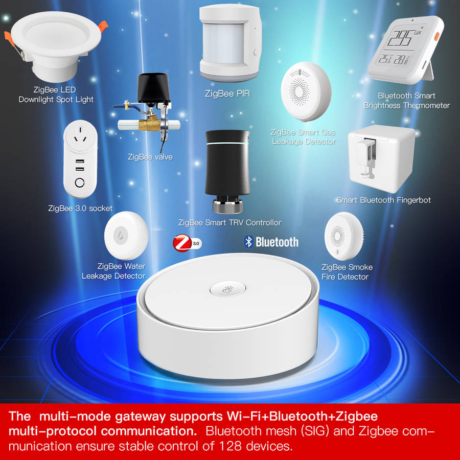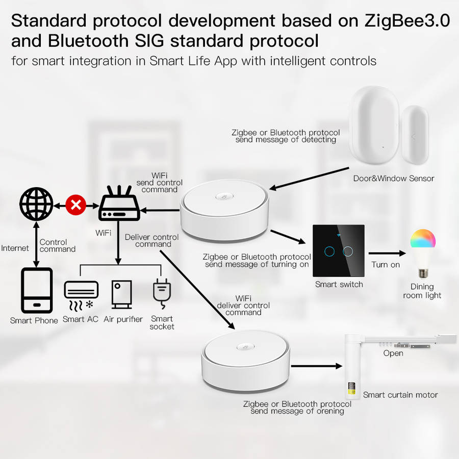 Main Features: 1.Sub-device control as multi-mode compatible: Control sub-devices of the gateway, supporting remote control and group control for connected Bluetooth and ZB smart devices in Smart Life App as multi-protocol communication for ZB 3.0 standard protocol and Bluetooth SIG standard protocol based,ensuring stable control of 128 devices as strong performance.