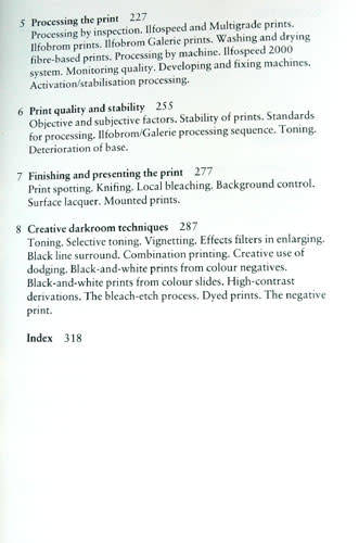 This book concentrates on the processing and printing techniques necessary to produce work of the highest quality. The first two chapters outline the structure and characteristics of monochrome materials, and the principles of processing them. Some understanding of these topics will help every photographer to choose the product best suited to a particular job, and to recognise and rectify processing faults. Further chapters describe in detail modern darkroom equipment and procedures, both small-scale and large-scale, from negative processing and after-treatment to print exposure, development and finishing. Finally, creative techniques such as toning are discussed. Illustrated.