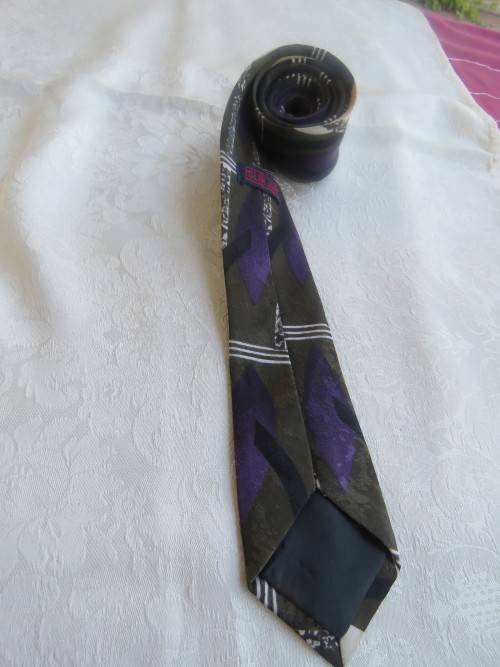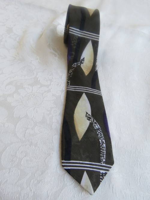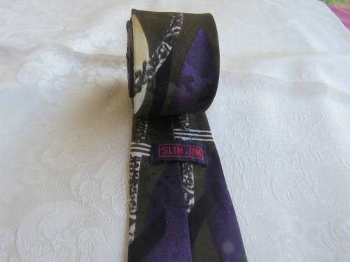 Fashionable narrow men's necktie in dark green,cream and purple by 'SLIM JIM'.Width 5.5cm.As new.