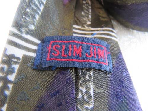 Fashionable narrow men`s necktie in dark green,cream and purple by `SLIM JIM`.Width 5.5cm.As new.
