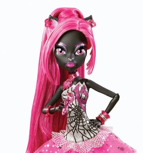 Monster High Catty Noir Doll: All ghouls will shout Me-WOW over the coolest werecat on campus. Since her debut on Friday the 13th; the superstitious; Catty Noir has been a hissing-fit of glitz and haunt cattoure. The newest character - and pop star - at Monster High has sleek black skin that blends right into the night for secret feline fun and is also dressed to impress for day play or out-on-the-town adventures with her BFF (beast friends forever). She’s rocking a hot pink tulle skirt with jagged layers; fierce flounces and a silver bodice emblazoned with a creepy cool spider web and bold lucky number thirteen. Her shiny silver knee-high boots; long magenta mane; multiple cat ear piercings and hip arm bangles complete her sensationally cat-hip ensemble.
