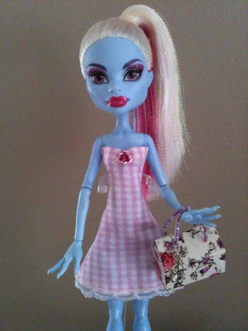 This pretty pink gingham dress is made to fit a standard Monster High doll. It's handmade from a cotton-blend and is hemmed with white lace trim. There is a beautiful rose detail on the bust. The dress comes with a cute pink felt jacket. Makes for a gorgeous party dress!