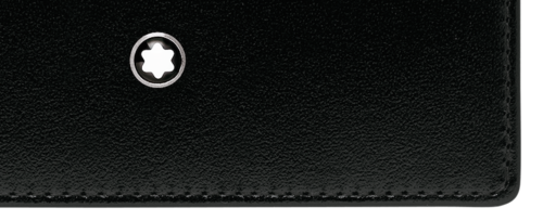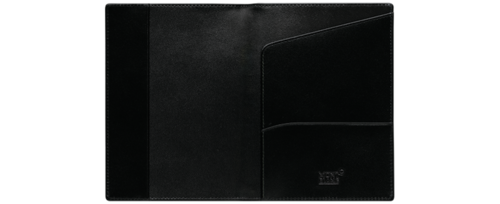 International passport holder made of black European full-grain cowhide with unique Montblanc deep shine, jacquard lining with Montblanc brand name, and a Montblanc emblem with palladium-coated ring, with pocket suitable for all international passports; additional pocket.