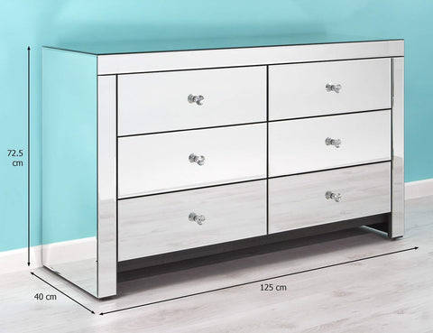 The Monte Carlo Six Drawer Mirrored Chest of Drawers would be an elegant addition to not only a bedroom setting but any room in your home. It sits well alongside all house styles/looks, from neo-classical to contemporary. The mirrored finish also adds a light, brighter look to a room with this in turn giving a bigger, more spacious feel to all areas, but especially smaller ones. This beautiful chest will adorn any room and space with a touch of grandeur everyone will love! This chest does not require any assembly and is delivered ready to use, it just requires the handles to be put on the drawer fronts which is very simple to do.