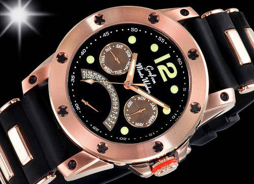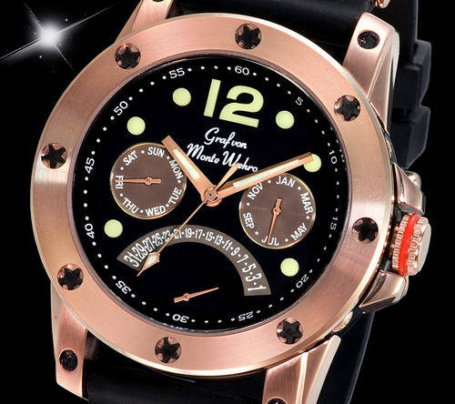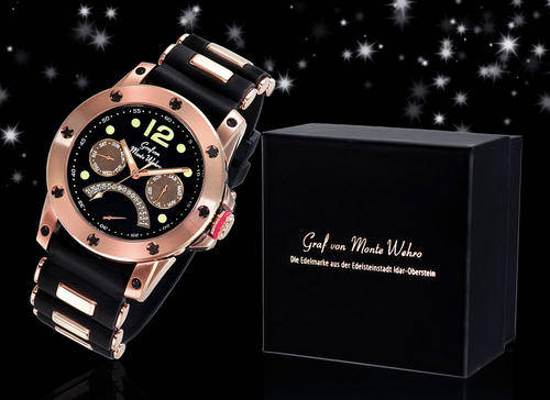 Facts and figures: Complete stainless steel rose gold platedAutomatic movement with a glass floor! View the automatic movement! Date display at 6 clock . Weekday at 9 clock Month to 3 clock Graf von Monte Wehro logo on dial High quality rubber strap with stainless steel inserts, and these rose gold! Brilliant look in black / rose! 5 ATM Water Resistant ! XXL Case 43.5 mm! 46.5 mm with crown ! Brilliant color combination. It could hardly be more striking. Weight about 157 grams extremly solid and heavy ... !! Graf von Monte Wehro clocks originating mainly made âÂÂâÂÂby hand. Supplied in original Graf von Monte Wehro box.
