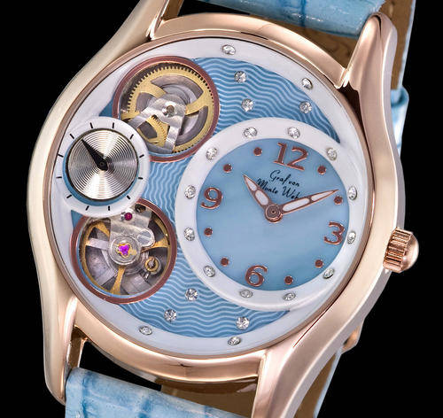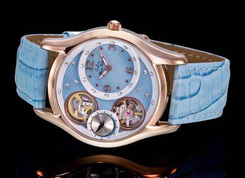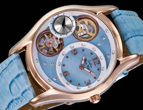 Two movements used! A real eye catcher .... Extremely extravagant design. Automatic movement for seconds drive. Quartz movement for hours & minutes. Count of Monte Wehro logo on the dial. Housing approximately 39 mm! With approximately 42 mm crown! Blue leather strap with blue stitching (deluxe version) Weight about 55 grams. Supplied in original Count of Monte Wehro box.