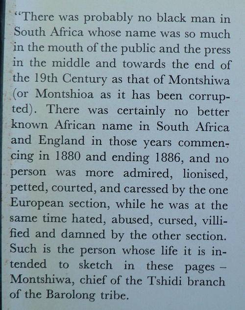 232 PAGES, SOME PHOTOS.STRUIK PUBLISHERS, 1966, FIRST EDITION. CHIEF MONTSHIWA 1814-1896, HIS LIFE, HIS TIMES, HIS COUNTRY AND HIS PEOPLE. CHIEF OF THE BAROLONG . LOTS OF ORANGE FREE STATE HISTORY FROM A BLACK PERSPECTIVE. VERY INTERESTING.