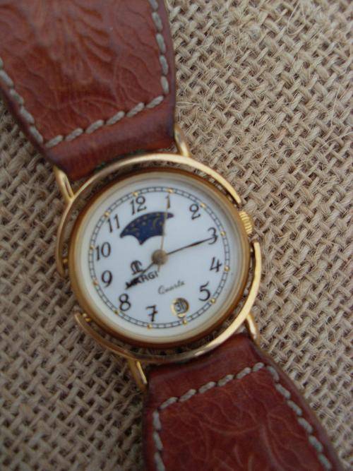 I bought this watch in Italy, super little watch with a handcrafted leather strap. The face tilt between the two half circle arms that connect to the strap. Needs a new battery.