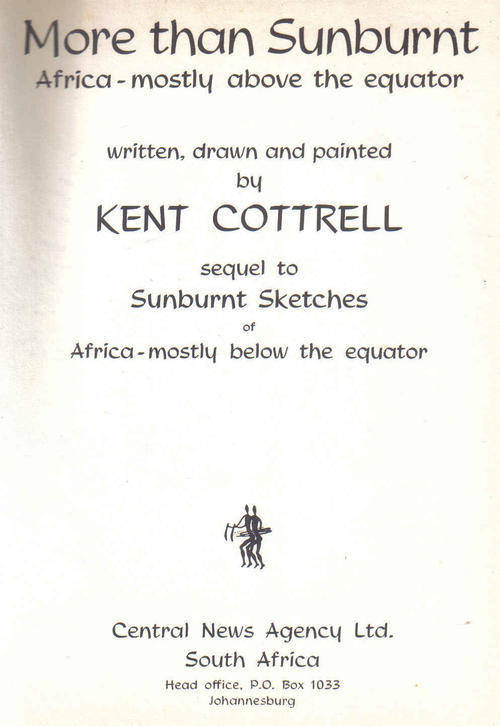 Ref 430 More than Sunburnt : Africa – mostly above the equator by Kent Cottrell Hard Cvr Publishers – Central News Agency 1958 Prc R80 Mkt Prc R350 many artistic colour & B/W illustrations Condition : Fly leaf none - Book Cover – v good [ covered by transparent loose plastic ] ; foxing on first few and last few pages Size - 270mm x 210mm x 20mm thick weight - 350grams