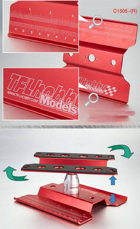TFL Hobby model Repair Station Aluminum RC car Assembly Platform Shunting Station? ? Feature: 1 Adjustable height 2 Free to rotate or lock 3 Can be placed more shock absorbers 4 Easy accessibility, small size and easy to carry ? Specific: Brand:TFL Hobby model Model:C1505-(R) Material:Aluminum Process: CNC machining, anodizing coloring Application: 1: 8 1:10 1:16 ?Road Climbing Car Trucks and Other Vehicles Repair and Adjustment Specifications: Length: 140mm Width: 134mm Height: 90-64mm ? Package: 1*Repair Station ? , , , , ,