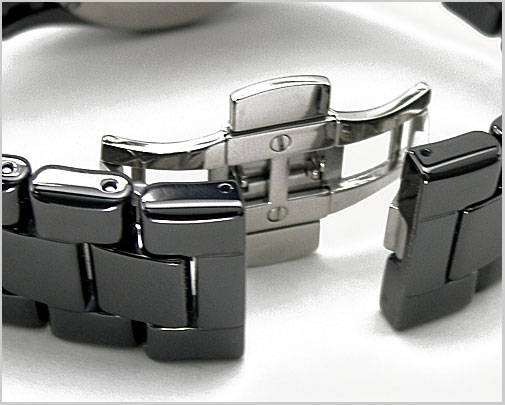The ceramic belt that black luster is beautiful. The camera back is made by stainless steel.