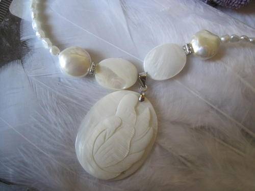 Mother-of-pearl carved swan pendant, on pearls and MOP. Unique.