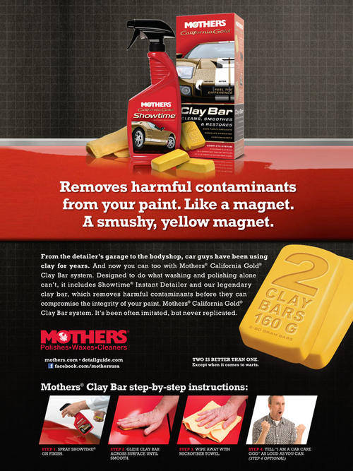 You’ve heard about clay bars—professional detailers, body men and your car buddies all talk about how they work. Now use the clay bar everybody wants. Created to remove the particulate debris and contaminants that washing and polishing can’t, our exclusive Clay Bar System will remove embedded grains of metal, tree sap, airborne environmental deposits and paint overspray. Better yet, our clay bar isn’t hazardous to your paint—it’s just firm enough to pick up the bad stuff, without being too aggressive. Use Mothers®Clay Bar to get rid of paint fouling grime and pave the way for complete waxing.