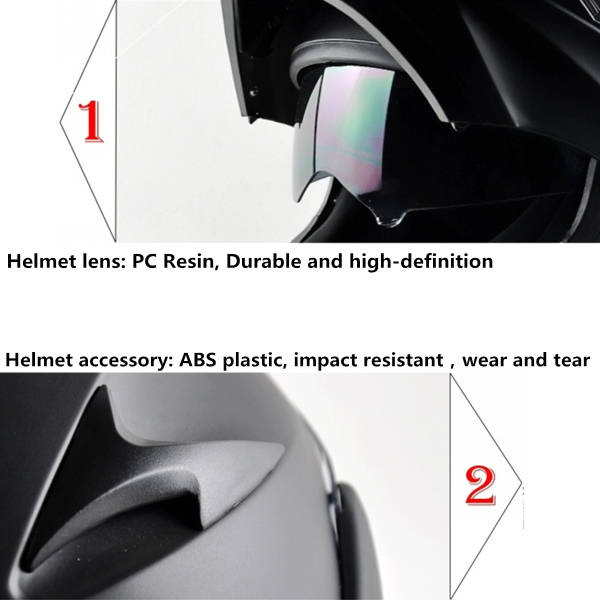 Description: Application: motocross biker/bicycle rider Resistance to penetrate, impact resistance The inner pads can be moved and washed Streamline design reduces wind noise Advanced lightweight durable ABS shell,quick release strap for easy use Ventilation system,heavily cushioned and very comfortable interior Dual visor design.Front anti-fog, anti-scratch and wide visual field clear visor Inner dark tinted aerodynamic visor.Quick release visor mechanism Full face and flip up modular helmets.Sleek modular design Well vented all purpose product for off-road riding