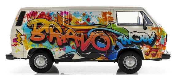 Motormax Motor Max Diecast Model Car 79599 , VW Volkswagen Kombi T 3 T3 Transporter Panelvan "Bravo" Graffiti , 1/24 scale , new in pack