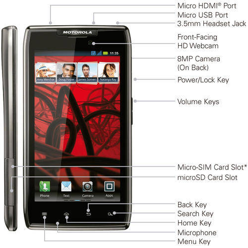 RAZR MAXX delivers up to 17.6 hours of talk time so you won't spend your day plugged into the wall. However its 1GB RAM combined with a dual-core 1.2GHz processor and Android™ operating system will ensure you are always entertained, delivering a lightning-fast user interface and the power to multi-task like never before. You can rock your playlists while checking email, breeze through photos ÂÂÂÂÂÂÂÂ all day, every day, all at the same time. Still seriously thin at just 8.99mm, RAZR MAXX is the exact opposite of frail. It's made strong with KEVLAR® fibre, while Corning® Gorilla® Glass defends the hyper-vibrant 4.3-inch Super AMOLED Advanced display from scratches and scrapes. General2G NetworkGSM 850 / 900 / 1800 / 1900 3G NetworkHSDPA 850 / 900 / 1900 / 2100 Announced2012, April StatusAvailable. Released 2012, May BodyDimensions130.7 x 68.9 x 9 mm Weight145 g DisplayTypeSuper AMOLED Advanced capacitive touchscreen, 16M colors Size540 x 960 pixels, 4.3 inches (~256 ppi pixel density) MultitouchYes ProtectionCorning Gorilla Glass SoundAlert typesVibration, MP3, WAV ringtones LoudspeakerYes 3.5mm jackYes MemoryCard slotmicroSD, up to 32 GB Internal16 GB storage, 1GB RAM DataGPRSYes EDGEYes SpeedHSDPA, HSUPA WLANWi-Fi 802.11 b/g/n, DLNA, Wi-Fi hotspot BluetoothYes, v4.0 with A2DP, LE, EDR USBYes, microUSB v2.0 CameraPrimary8 MP, 3264x2448 pixels, autofocus, LED flash, check quality FeaturesTouch-focus, geo-tagging, face detection, image stabilization VideoYes, 1080p@30fps, check quality