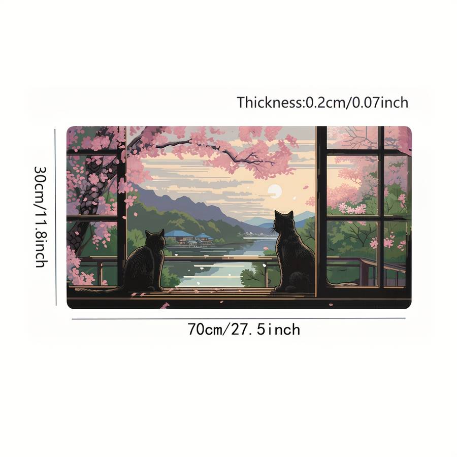 Extra Large Japanese Cherry Blossom & Black Cat Desk Mat - Non-Slip Rubber Base,