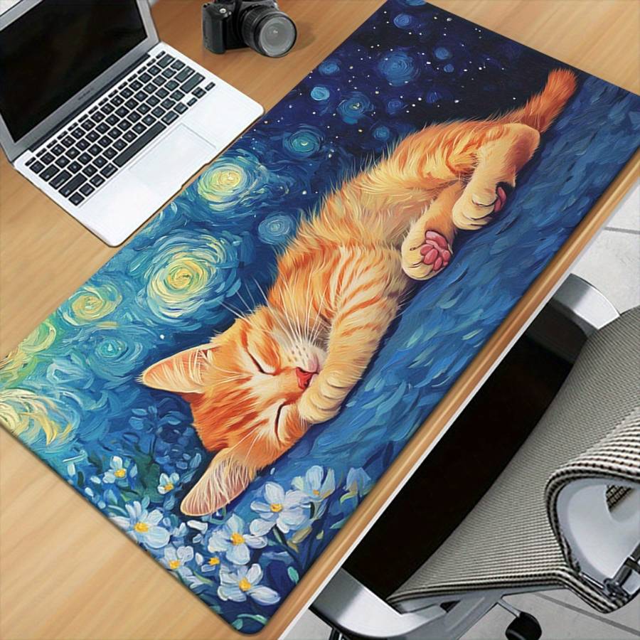 1pc XXL Van Gogh Starry Night Sleeping Cat Desk Mat - High-Definition Printed Ru