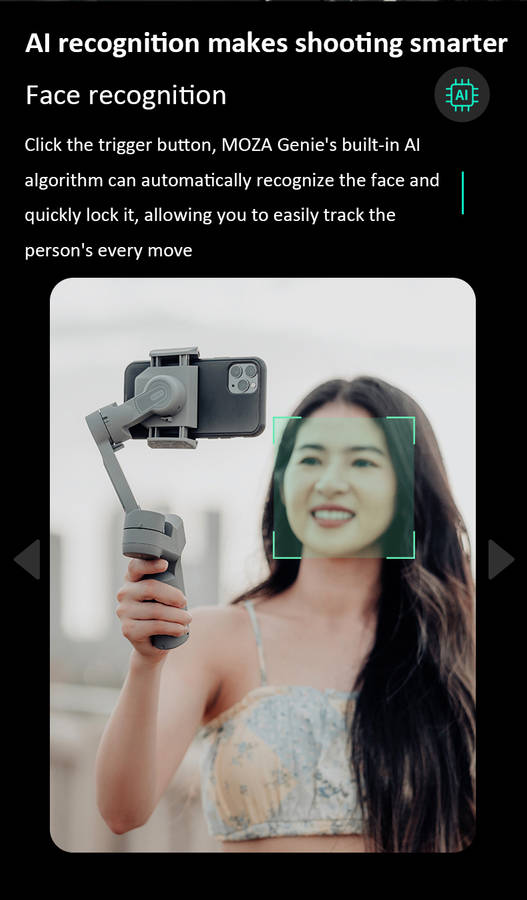 AI recognition makes shooting smarter: Click the trigger button, MOZA Genie`s built-in AI algorithm can automatically recognize the face and quickly lock it, allowing you to easily track the person`s every move