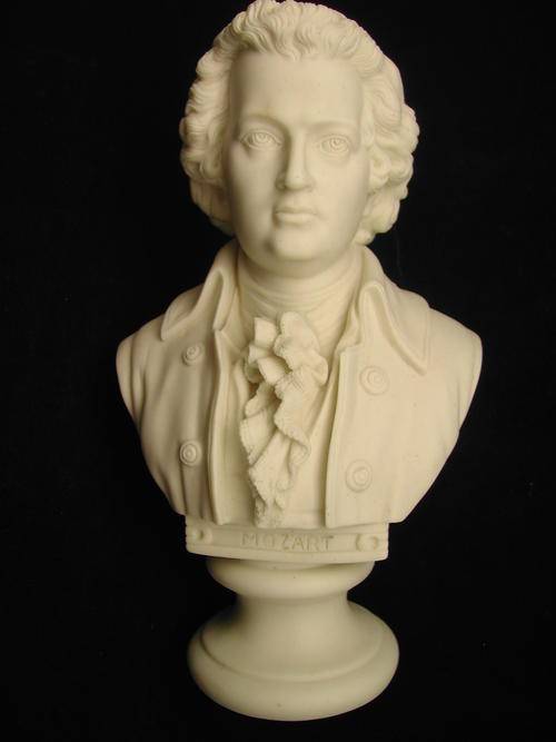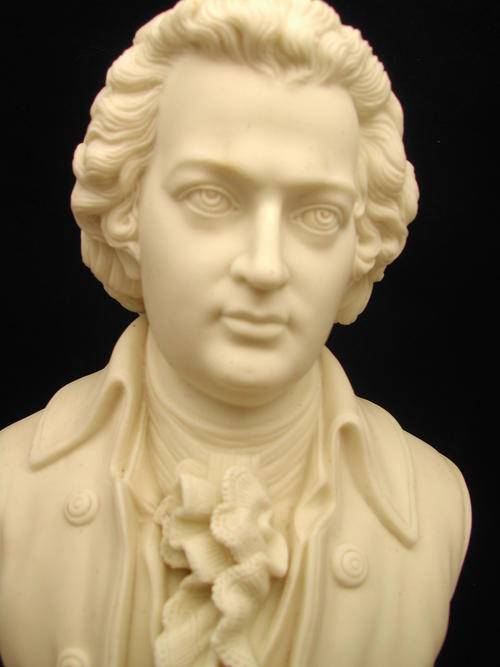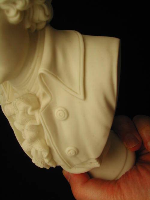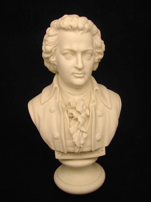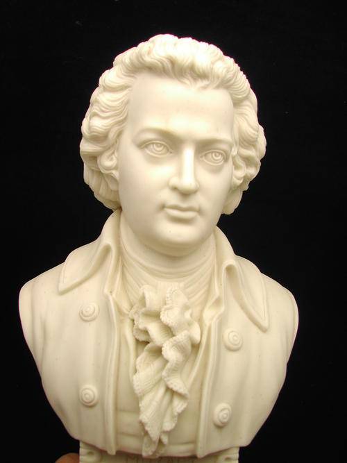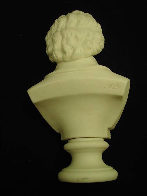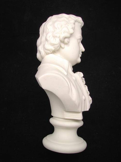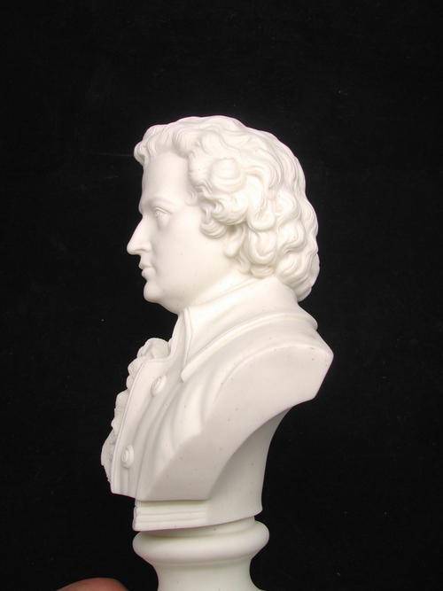 Robinson & Leadbeater produced parian ware in Stoke on Trent from the mid 1880’s, into the twentieth century. They were renown for the fine detail of their Victorian busts. The detail on this image of Amadeus Mozart is striking – please zoom-in on the picture for a closer look. He has R&L impressed to his back. Amadeus stands 23cm tall. The very tip of his left lapel has a tiny chip to it – I have photographed this, so please study the pictures carefully. This apart, he free of chips, cracks, or restoration. Please add R55 for postage.