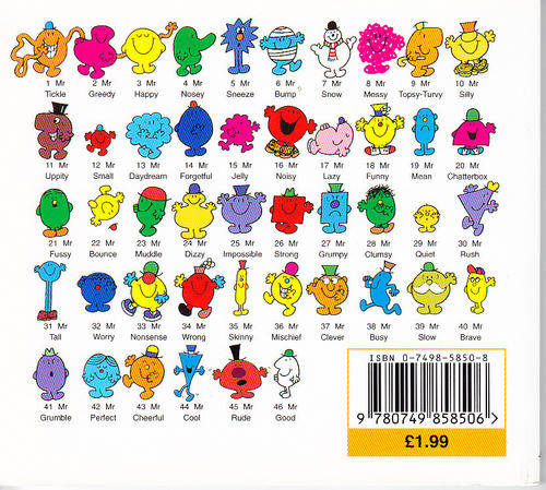 Please note that the black spots along the spine belong there, they are part of the wording "My Mr. Men Library" which forms along the spine if you collect all the Mr. Men books. (see picture below). I have all the Mr. Men books for sale up to number 45.