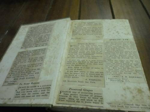Mrs. Beeton's Jam-Making including Preserves, Marmalades, Pickels and Home-Made Wines. 400 Recipes with black and white photo illustrations. Newspaper recipe clippings of (Rhubard, grape, melon jam conserve etc) pasted on clear end pages. Recipe of Green fig jam written in on last clear page.