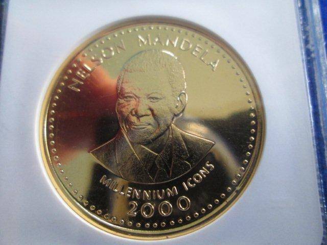 From the Somali Republic comes this full-sized (38mm) Important Presentation Crown, dated 2000 and from the Millenniun Icons series of commemorative Crowns. This SPECIAL V.I.P. ISSUE has the denomination of 250 shillings 23 grams Sterling Silver and has been Gold plated, honouring the great Nelson Mandela.