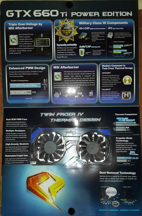 The MSI N660 Ti PE 2GD5/OC graphics card incorporates MSI's exclusive Triple Overvoltage technology and Enhanced PWM Design architecture to boost overclocking potential by up to 18.2%. Perfect cooling is supplied by the new Twin Frozr IV Thermal Design and exclusive Dust Removal technology automatically removes dust from the heat sink module and maintains optimum cooling performance. Propeller Blade technology increases airflow by 20% compared to conventional fans, effectively reducing the temperature by up to 14? and operating noise by 17.1dB. The GTX 660 Ti Power Edition also features Military Class III components, emphasizing on high quality and stability to provide gamers with a smooth and dependable working environment during overclocking or playing games. The MSI GTX 660 Ti Power Edition incorporates exclusive features and technologies in the power supply, cooling and materials that exceed the specifications of the reference board. The superior overclockability and stability make it the ideal choice among its class.