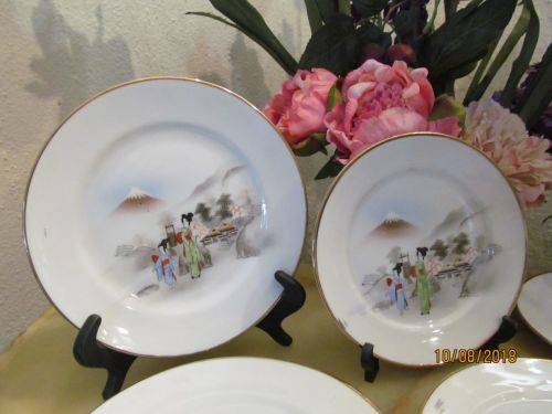 A RARE SET OF JAPANESE TEA PLATES AND MATCHING SIDE PLATES EACH MANUFACTURED FROM TRANSLUCENT FINE PORCELAIN AND ALL HAND DECORATED IN RICH GOLD TRIM AND JAPANESE SCENERY DEPICTING A SNOW PEAKED MOUNT FUJI IN A BACKGROUND CONTAINING A JAPANESE RURAL LANDSCAPE WITH TWO YOUNG GEISHA GIRLS STANDING IN THE FOREGROUND