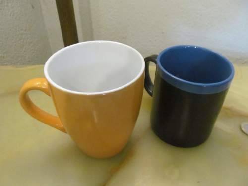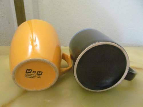STAMPS/MARKS ETC : THE CARAMEL OCHRE MUG IS STAMPED - "PnP, MICROWAVE SAFE, DISHWASHER SAFE, STONEWARE. THE OTHER CUP IS NOT STAMPED