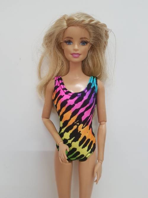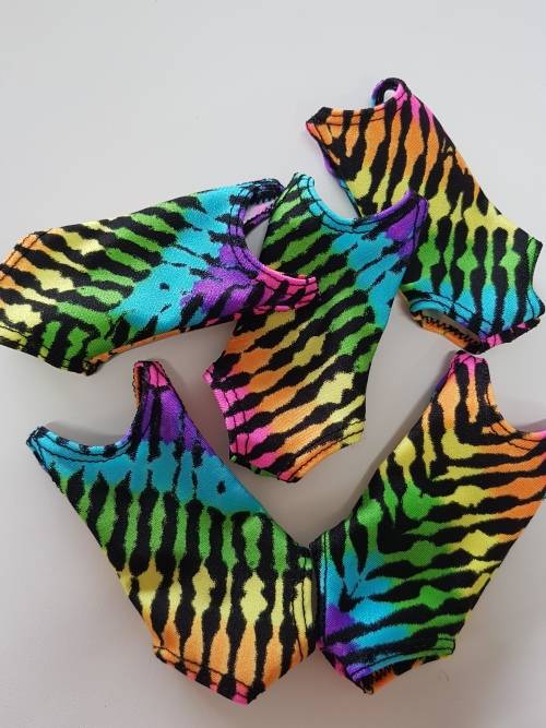 The leotard is made by Hillegonda using Lycra fabric. It fits most Barbie dolls. The price is for one (1) leotard only. The colors may differ, but the leotards are all cut from the same piece of fabric.