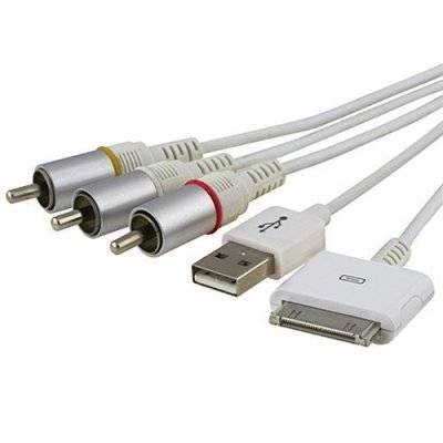 The Composite AV Cable connects to your iPod, iPhone, or Universal Dock via the 30-pin dock connector and to your TV, home theater receiver, or stereo receiver via the Composite( yellow) video and red/white analog audio ports. .