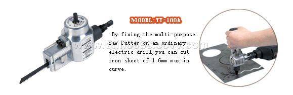 Specification: 1).To be fitted with a 10mm general main.Dia.an electric drill or a 10mm general main.Dia.an gas drill. 2). To cut steel plate within 1.6mm,stainless plate within 1.2mm,360 changeable direction of Tool Rest at operation.(su-ggest speed 2 meters per minute with 3000rpm.),By replacing another Tool Rest,you can cut 5mm max.of plastic plate,fibre plate,perspex and plywood etc. 3). To saw woods,plastic,or some other non-metal materials of 20mm max.thickness(suggest speed 1meter per minute with 3000rpm min.) 4). To saw metal,copper and other similar materials of 5mm max.thickness.(suggest speed 0.5 meter per minute with 300rpm max.rotational speed according to the style of saw blade.) 5). Min.Cutting Dia.:25mm 6). Min.Sawing Dia.:30mm