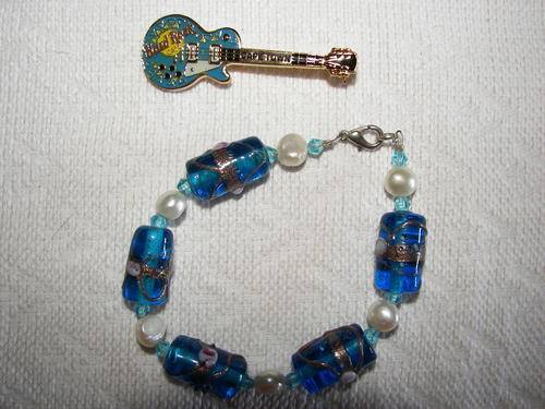 BRACELET- WITH FRESH WATER ROUND PEARLS AND ORNATE GOLD / BLUE BEADS-NEVER WORN