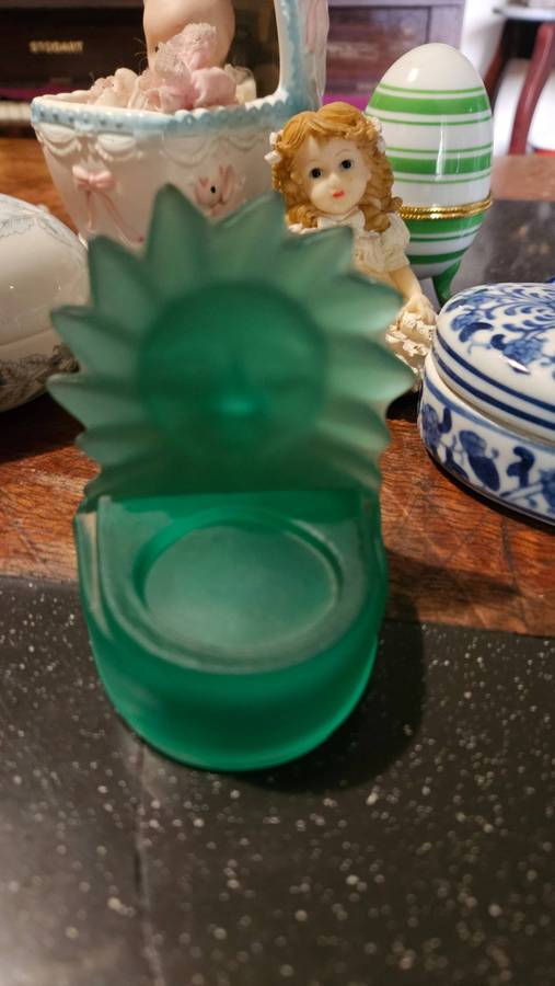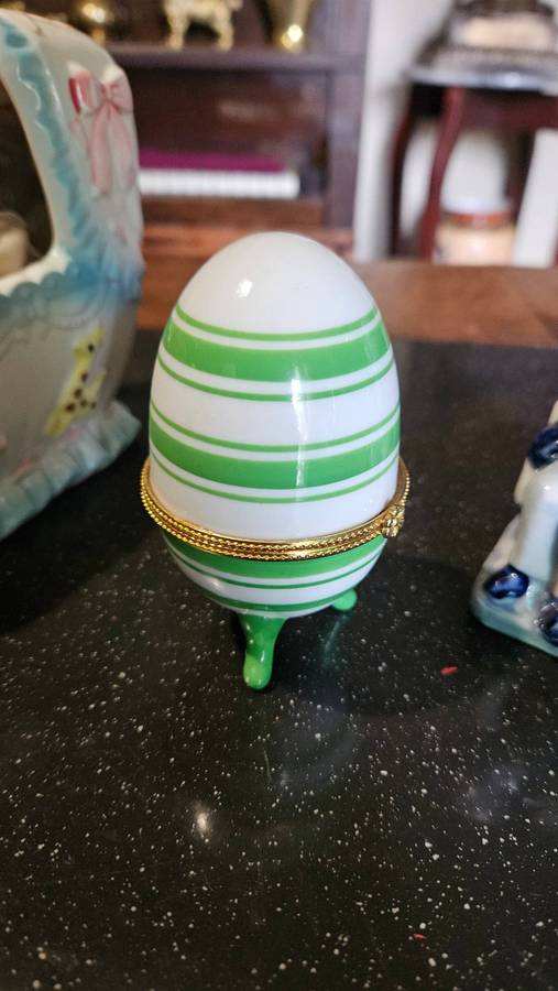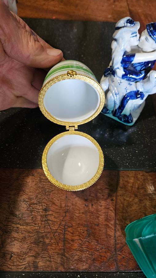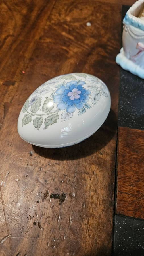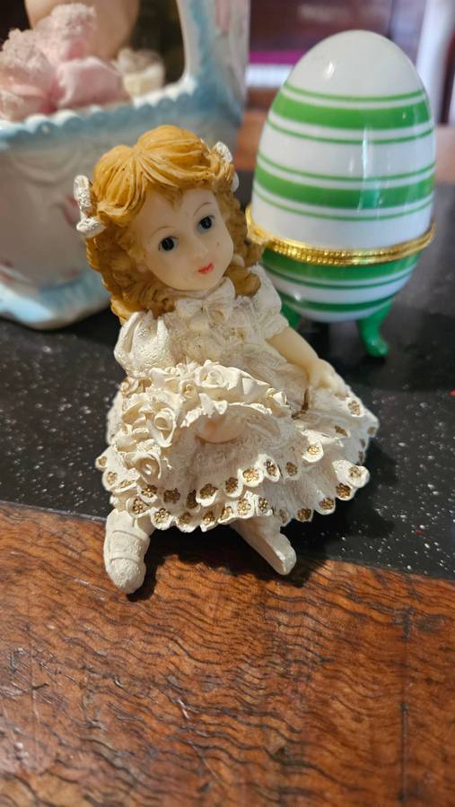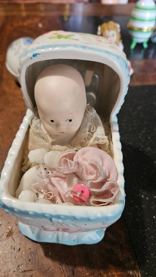 The wind-up musical Baby in coy works and is in a good condition. The wedgwood is in a good condition. The heart shaped trinket has a small chip on inner rim. All other items are in a good usable condition