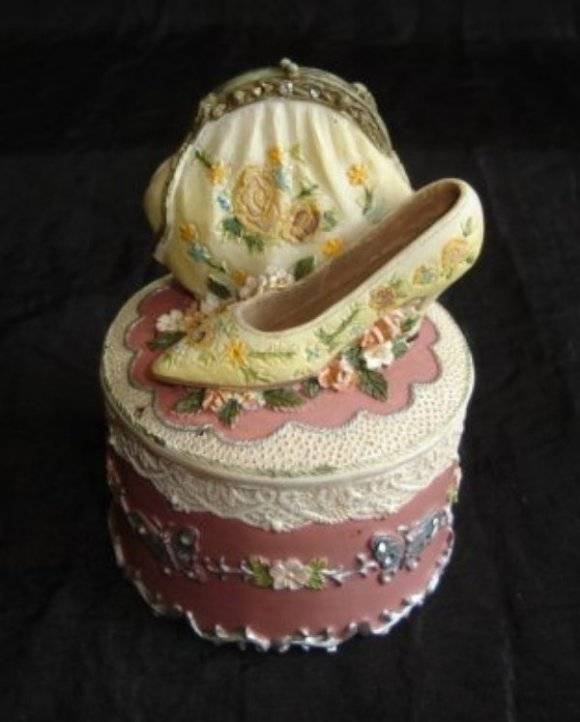 A LOVELY MUSICAL BOX WITH TUNE ' WISH UPON A STAR', IN SHAPE OF A CAKE, WITH DIAMANTE BUTTERFLIES AND FLOWERS AROUND, AND LADIES FLORAL SHOE AND PURSE WITH DIAMANTE DETAIL. SOME DIAMANTE MISSING, NOT WORKING, MARKED TO BASE, DISNEY