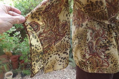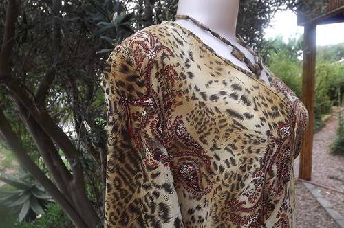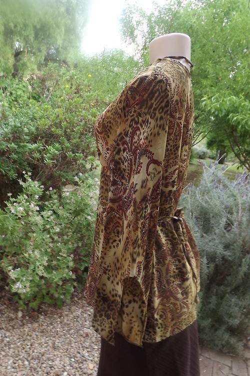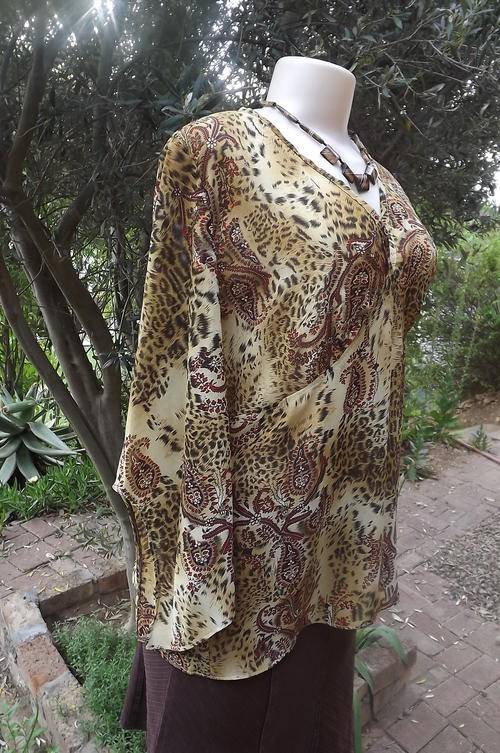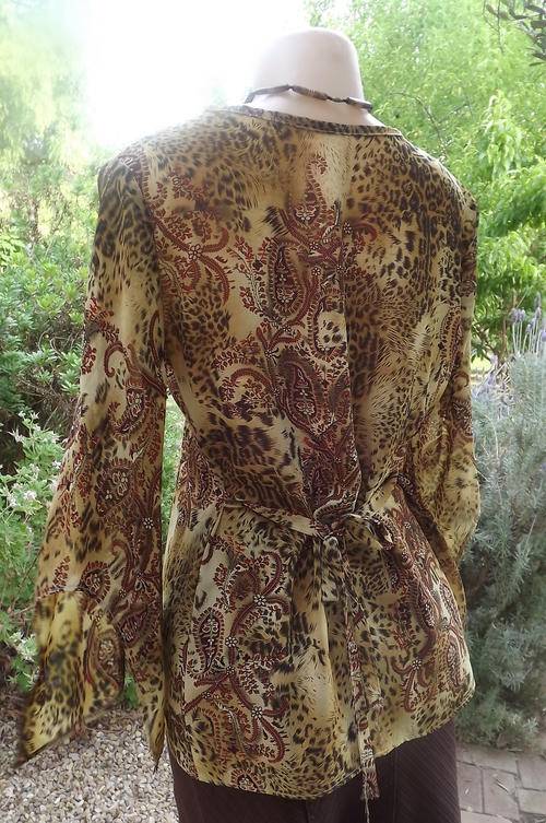 Mustard Colour Animal Print Top with Maroon Paisley Print Pattern in size 12/36 - V Neck and Fabulous Wide, Open Sleeves - straps at sides to tie at the back - good condition - 100% Polyester