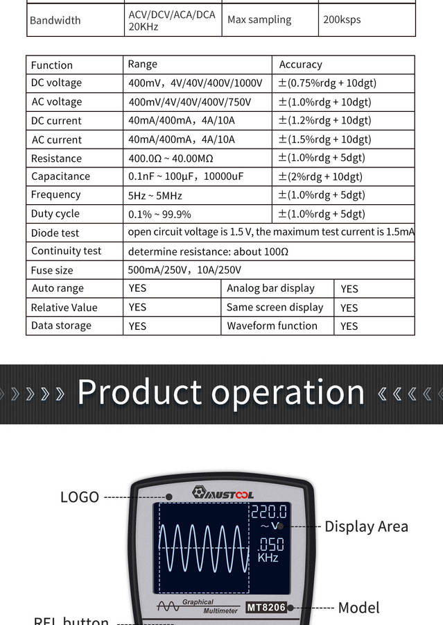 1.Analog Bandwidth : ACV/DCV/ACA/DCA 20kHz , 200k high-speed A/D sampling