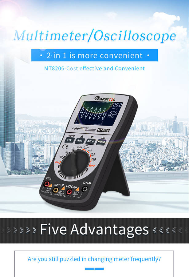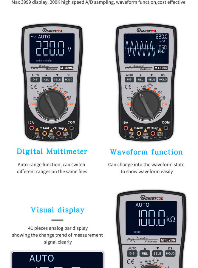 3.Digital multimeter with 41-segment analog bar display,200k high-speed A/D sampling,4000 counts auto-range(can be selected manually), one-button switch of graphical waveform display during measurement