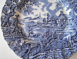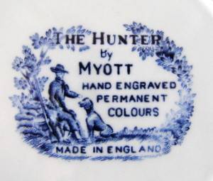 A Myott blue and white plate of sideplate size, depicting The Hunter - a man with his dog and rifle near to a Tudor style house.