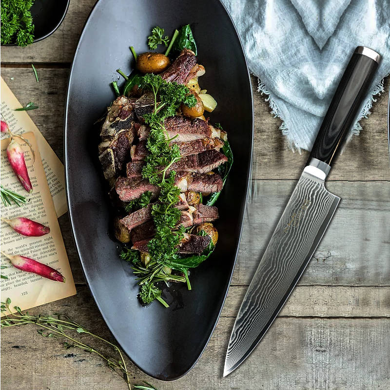 Hardness and toughness coexists in our Japanese VG10 stainless steel. which means sharpness and the feature of no need sharpening coexist. [User-friendly]: The chef’s knife is lightweight and well balanced, so you won’t feel bogged down. It has a good ergonomics that reduces the chance of experiencing aches and cramps on the finger after use. Its fluted edge minimizes the possibility of food sticking to the blade.
