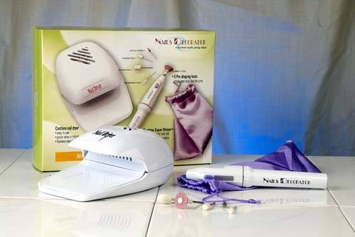 Nail Decorator - Excellent nails every time. Cordless super shaper - gentle on nails yet strong enough for acrylics. Cordless nail dryer - easy to use, polish dries in minutes, flawless salon finish. Includes: cuticle pusher, shaping tool, buffing tool and fine shaping tool.