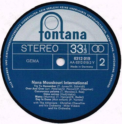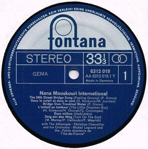 1971 German FONTANA pressing, release number 6312 019, of gate-fold compilation album by NANA MOUSKOURI: Nana Mouskouri International. The track & other details are shown on the images, as provided. The record is in a seldom played, near mint condition. The cover has some light edge crinkles, with lifting laminate at various places on front & back, otherwise in a very good plus shape. M- / VG |